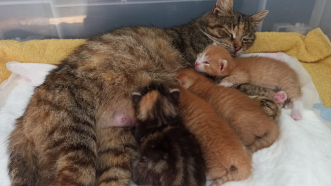 Kotki po zabraniu z terenu zakładu trafiły do poradni weterynaryjnej, gdzie okazało się, że kocia mama jest skrajnie niedożywiona i ma infekcje dróg oddechowych, a częściowy brak uzębienia oraz stan pozostałych zębów pozostawia wiele do życzenia.