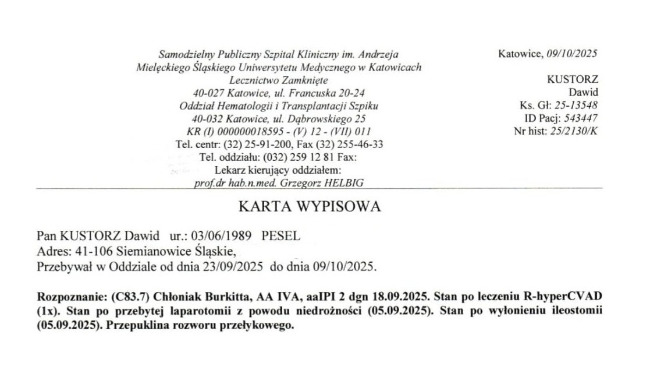 Na początku września 2025 roku, los niestety postawił Dawida przed kolejną, tym razem jego osobistą, walką o życie. Trafił do szpitala na operację ratującą życie, po której usłyszał druzgocącą diagnozę: chłoniak Burkitta. Lekarze są dobrej myśli – ten typ nowotworu jest podatny na leczenie, jednak droga do zdrowia wymaga czasu, pozytywnego nastawienia i niesamowicie silnej woli. Niestety, po pierwszej serii chemioterapii pojawiły się groźne powikłania – przestały pracować nerki, a organizm nie przyswajał potasu. Była to kolejna, ciężka bitwa, którą szczęśliwie wygrał – udało się przywrócić funkcje nerek.