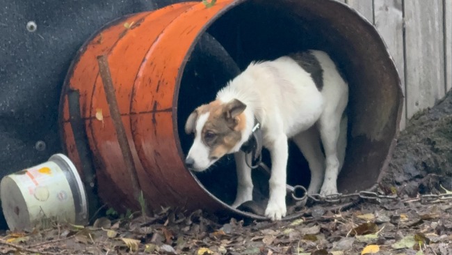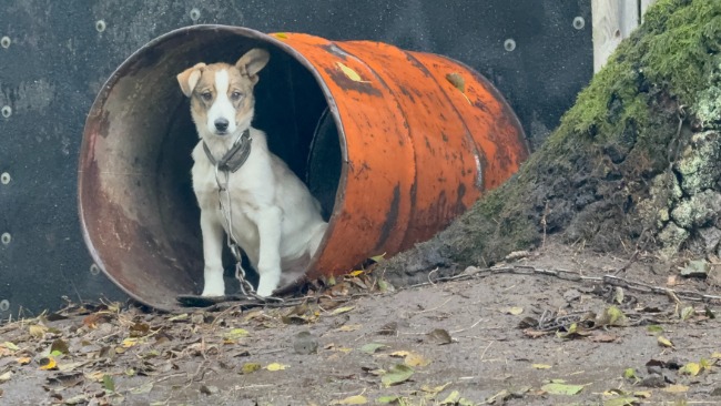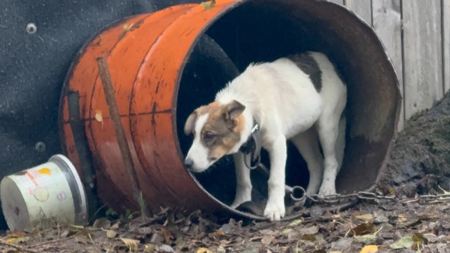 W środku lasu, na odludziu, kilometr od najbliższego domu, znaleźliśmy małego psa – przywiązanego ciężkim łańcuchem do zardzewiałej beczki bez dna, w której miał „mieszkać”.