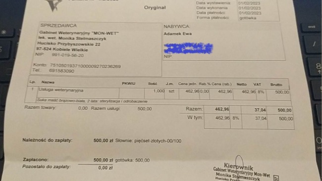 Załączam rachunek za sterylizację suczki.