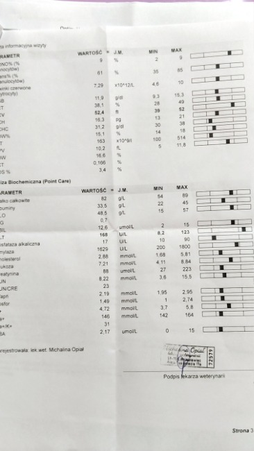 Józia ma wodnistą, śmierdzącą biegunkę. Testy na panleukopenię, giardie i kociego koronawirusa – ujemne. Wyniki krwi nie pokazują nic konkretnego. A biegunka nadal się leje. W poniedziałek szersza diagnostyka i USG.