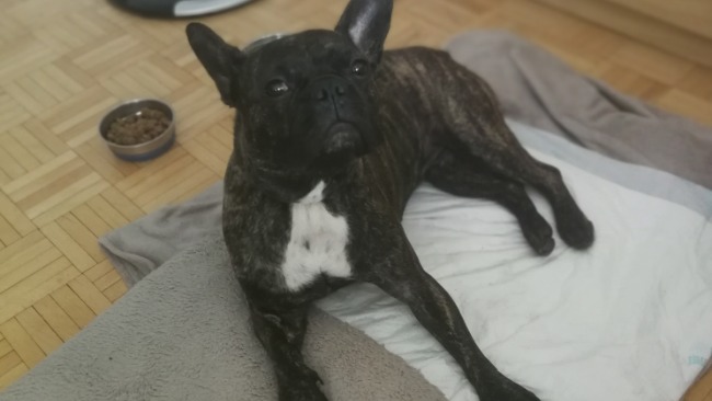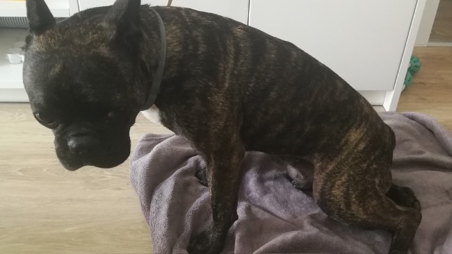 Fifi jak większość buldogów ma przepuklinę miedzykregową. Z kręgami jest wszystko w porządku. Kawałek dysku międzykręgowego znowu się wykruszył co spowodowało czasowy paraliż. Ucisk na rdzeń był zlokalizowany w tym samym miejscu co przed operacją rok temu.