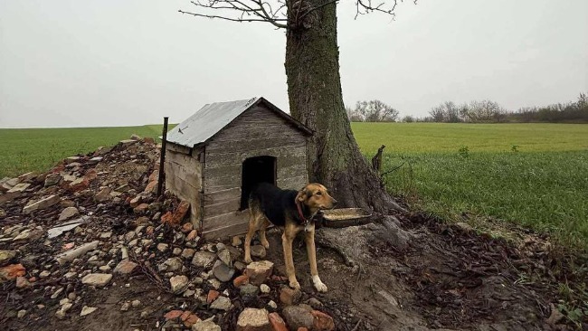 Psy przybite do palików pośrodku niczego, pilnujące błota i gówna.