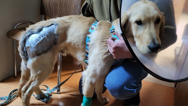 Kokos został w szpitalu i miał kolejny zabieg aby złączyć te kości i ostatecznie ma kolejną ranę oraz gips.. Porusza się na 3 łapach, gips uciska mu cewkę moczową co utrudnia oddawanie moczu..