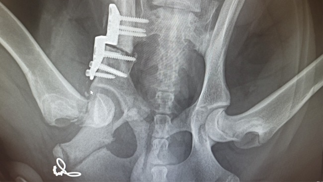 Zachowanie Kokosa nas niepokoiło, było czuć pod dłonią w miejscu opweiwwnym że coś się porusza. Szybkie RTG - złamanie główki kości udowej.. Z niczyjej winy - ryzyko, powikłanie po zabiegu 😭 (miejsce gdzie widoczna jest myszka komputerowa).