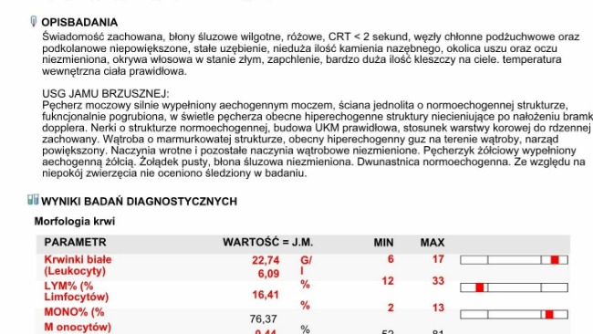 Kiedy do nas trafił, jego stan był dramatyczny. Dziś wiemy już więcej – Kosmo zmaga się z anemią, ma guza na wątrobie, zapalenie pęcherza, zwyrodnienie kręgosłupa. Nie słyszy. Każdy krok sprawia mu ból. Jego wyniki to jedna wielka alarmująca czerwień.