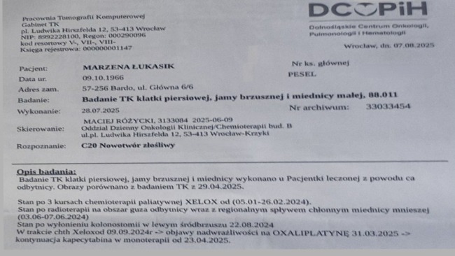 - w 2023 usłyszałam diagnozę nowotwór złośliwy jelita grubego, od tego czasu przebywam na zwolnieniu lekarskim, a to oznacza, że nie mogę pracować zawodowo, a moje dochody znacznie się zmniejszyły. Leczenie pochłania ogromne siły i środki. Kilka razy w miesiącu jeżdżę na badania i chemioterapię. Przeszłam cykle radioterapii i zabieg kolostomii. Z powodu przerzutów nie można przeprowadzić operacji usunięcia guza, pozostaje mi długotrwałe leczenie i poszukiwanie nowych metod.
