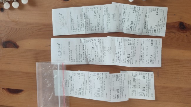 Udało mi się namierzyć część paragonów. Niestety nie posiadam wszystkich, bo albo zapomniałam wziąć, albo nie odłożyłam gdzie trzeba. Mój błąd.