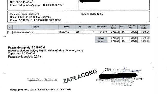 P.S. Dotychczasowe wydatki na leczenie Pixie to już ponad 10 000zł. Natomiast poniżej ostatnia z faktur.