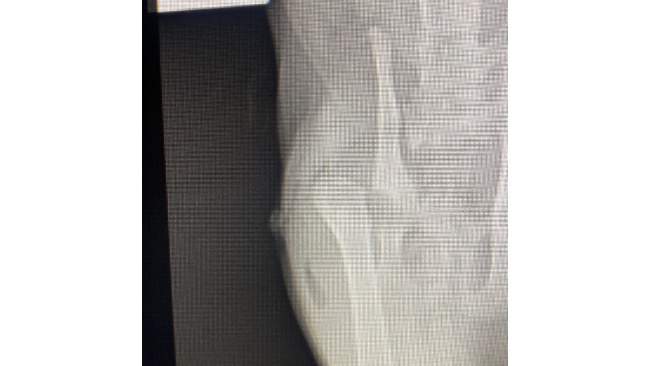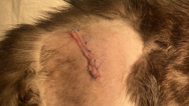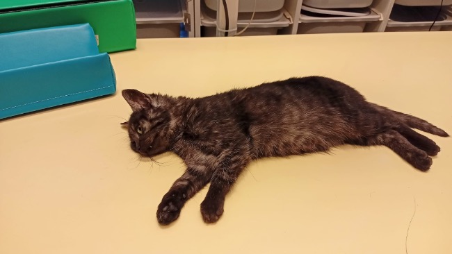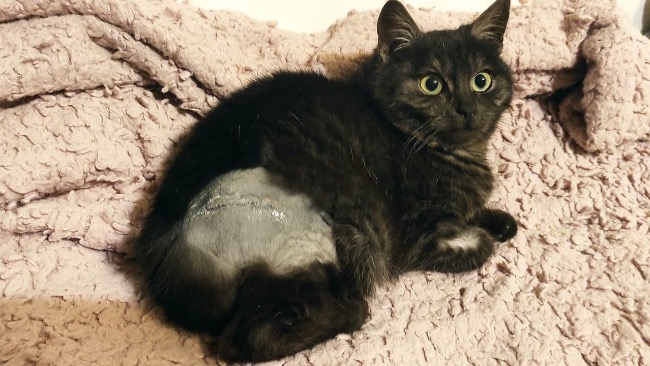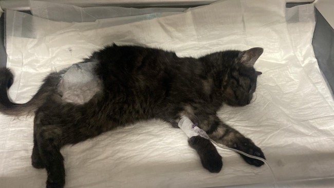 Kociak trafił do lecznicy na diagnozę, potem operację. Wykonano badanie RTG i badanie ortopedyczne. W tylnej łapie stwierdzono przynasadowe złamanie dalszej kości udowej, konieczność resekcji głowy kości udowej, zwichnięcie stawów biodrowo-krzyżowych. Przeprowadzono resekcję głowy kości udowej. Odstąpiono od próby stabilizacji złamania kości udowej i stawu biodrowo-krzyżowego z uwagi na rozpoczęcie się stabilnego procesu zrostu wymienionych kości.