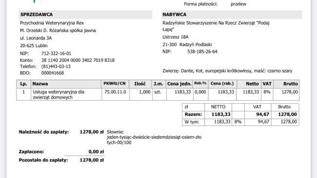 Koszt badań i operacji - 1278 zł. Kwota zbiórki obejmuje: