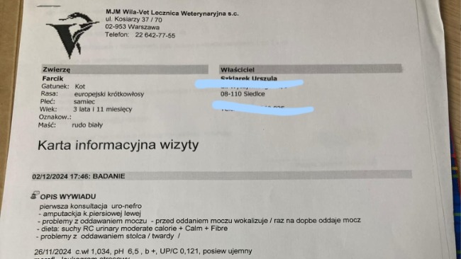 Jego codzienny płacz rozdziera moje serce. Zauważyłam, że dzieje się to zawsze w okolicy czasu kuwetkowania, kiedy Farcik próbuje robić siku. Jestem zrozpaczona. Wypróbowaliśmy już chyba wszystko co możliwe. Po miesiącach stanów zapalnych i odwiedzeniu wielu lekarzy padła paraliżująca mnie diagnoza. Farcik ma WADĘ ANATOMICZNĄ - brak prąciowej części cewki moczowej z przewężeniem w odcinku miedniczym potrzebna jest operacja.