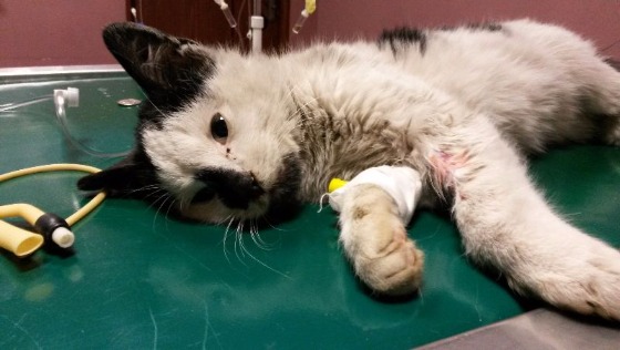 "Złamanie kości biodrowej po lewej stronie i zmiany osteolityczne w obrębie głowy i szyjki k.udowej prawej. W prawej pachwinie ropień. Kot bardzo wychudzony, odwodniony po wyleczeniu ropnia - wskazany zabieg amputacji główki w.udowej prawej. Do czasu zabiegu klatkoterapia i codzienna toaleta rany."