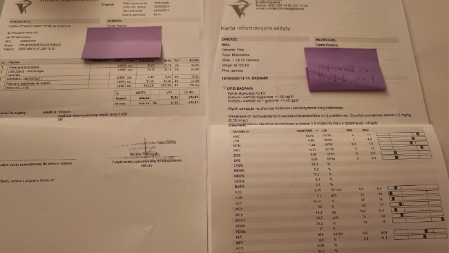 Hej! Jestem Mikusia i potrzebuję Twojej pomocy. We wrześniu skończę 2 latka. Od małego byłam bardzo energicznym pieskiem, ale pewnego dnia się to zmieniło. Byłam bardzo osłabiona nie chciałam jeść ani pić. Lekarze dawali mi różne leki, kroplówki, nawet była rozważana transfuzja krwi. Okazało się, że leczyli tylko w kółko moje objawy, przez 4 miesiące. Aż trafiłyśmy do kliniki, w której po kilku dniach badań udało się mnie zdiagnozować! Okazało się że to choroba Addisona i całe życie będę musiała brać leki żeby móc normalnie żyć. 1 zastrzyk kosztuje 600zł i będę go brać co 25dni do tego jeszcze mam anemię, która ciągle wraca. Zastrzyk na poprawę mojej krwi kosztuje 250zł na tydzień i nie wiem jak długo będę go musiała dostawać, być może też całe życie. Teraz po rozpoczęciu prawidłowego leczenia pierwszy raz od bardzo dawna czuję się dobrze! Jem normalnie, piję jak trzeba i bawię się swoimi ulubionymi zabawkami, chociaż moje wyniki nadal są złe. Moja właścicielka wydała na moją diagnozę i leczenie już całe swoje oszczędności, a sama jest na rencie. Dlatego chciałyśmy Was prosić o wsparcie. Każda wpłata pomoże, każde udostępnienie. Niestety mogę dodać tutaj tylko 2 zdjęcia, tych kart wizyt, wyników badań i faktur jest bardzo dużo bo ciągnie się to już od 23 stycznia aż do teraz więc wstawiam tylko najważniejsze, diagnozę, wyniki ostatnich badań i fakturę za 1 z leków.