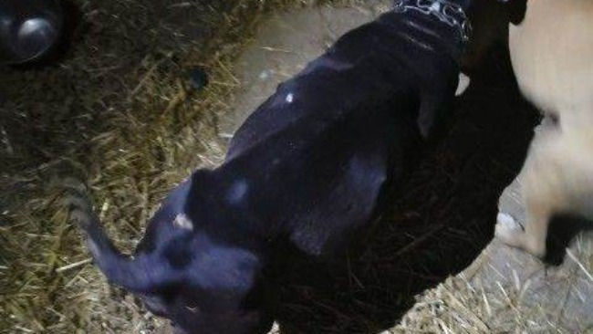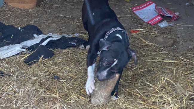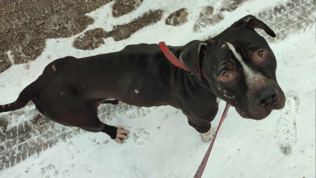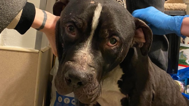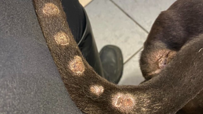 Pies jest skrajnie chudy, ma liczne strupy i ranki na całym ciele.