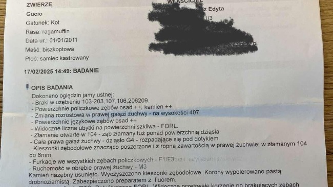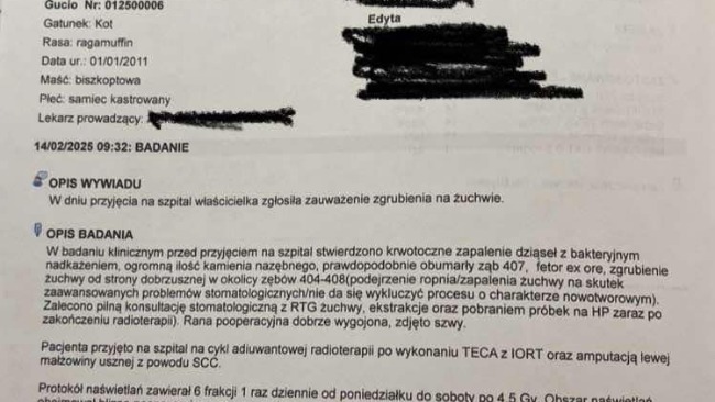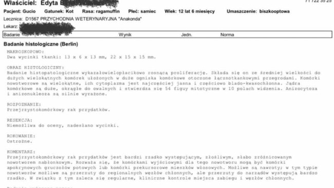 We wrześniu zaczął mieć problemy z uszkami, a w listopadzie 2024 okazało się, że ma w uchu polipa, gdy trafił do weterynarza z powodu pękniętego wrzoda w okolicach uszka. Przeszedł zabieg wycięcia polipa, a materiał trafił do badan w Niemczech. Okazało się, że to przejrzystokomórkowy rak przydatków, rak rzadki, złośliwy, szybko postępujący.