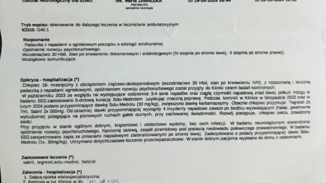 Z padaczka walczymy na oddziale neurologii rozwojowej Uniwersyteckiego Centrum Klinicznego w Gdańsku, który jest uznawany w Polsce za jeden z najlepszych w walce z padaczka jednak wymaga to od nas bardzo częstych wyjazdów na drugi koniec kraju. Od naszego miejsca zamieszkania do szpitala dzieli nas 590km. Nasz syn jest aktualnie po terapii sterydowej oraz ciągle przyjmuje leki, których skuteczność ciężko na tym etapie określić. Walczymy o każdy dzień bez ataków padaczki, które męczą Kubusia powodując u niego straszną senność oraz cofanie się w jego rozwoju.