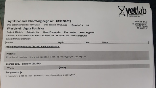 Aktualizacja: Przyszły wyniki kału, nie stwierdzono pasożytów . Miedzik został odrobaczony.