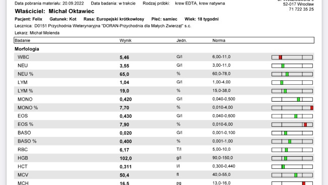 Feliks wczoraj dostał ostatni, 98. zastrzyk, tym samym zakończyliśmy kurację i wchodzimy w stan 84. dniowej obserwacji. Ostatnie 21. zastrzyków były ciężkie, ponieważ została zwiększona dawka leku. Feliks źle znosił iniekcje, a po wkłuciach miał odczyny na skórze. Wyniki krwi są zadowalające, dzięki temu pozostało tylko obserwować i trzymać kciuki, że wszystko będzie dobrze!