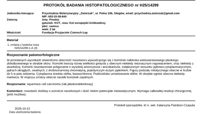 Przyznam się, że długo rozważaliśmy co zrobić. Pinokia trafiła do nas niedawno z Jerzmanowej, gdzie została zauważona przez mieszkańców. Pan, który nie przeszedł obok niej obojętnie i szukał dla niej pomocy myślał nawet, że ma odgryziony nos. Niestety rzeczywistość okazała się zupełnie inna. Nos Pinokii zaatakował rak płaskonabłonkowy.