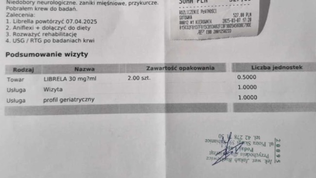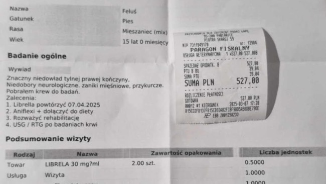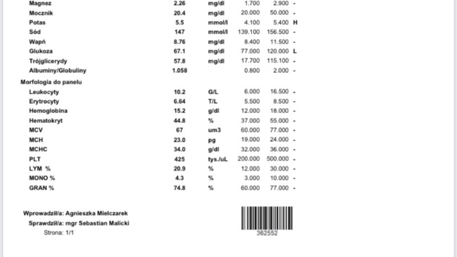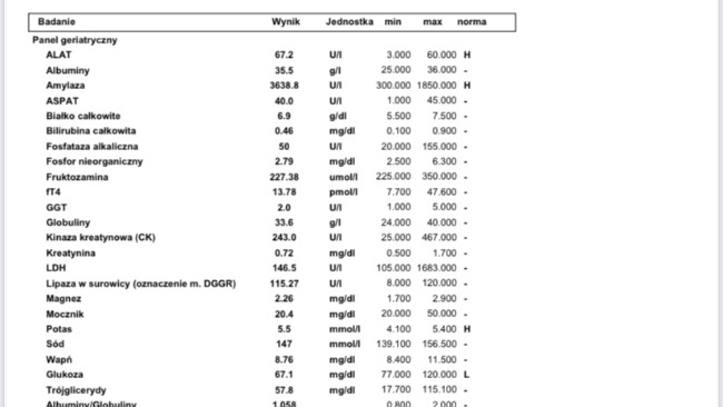 "Stan był już taki średni ok od kilku dni- miał problemy z podniesieniem się i utrzymaniem na tylnich łapach. Dostawał Opokan i Gabapentyne, według wskazań z wizyty w grudniu. Natomiast to leczenie już nie działa. Dziś koszt wizyty, badań krwi,RTG i nowego leku na miesiąc to ponad 500 zł. Felek jest już w domu. Jeżeli lek mu pomoże, będzie dostawał co miesiąc jedną dawkę na 30 dni. Tu sa wyniki krwi, ma bardzo podwyzszona Amylaze. Trzeba zrobic USG zeby wykluczyc guza trzustki. Lek póki co pomógł- Felek zaczal samodzielnie wstawac i chodzic po podworku."