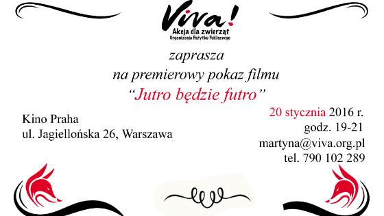 Fundacja Międzynarodowy Ruch Na Rzecz Zwierząt Viva! zaprasza na pokaz premierowy filmu "Jutro będzie futro". Jest to pierwszy pełnometrażowy film dokumentalny o przemyśle futrzarskim w Polsce.