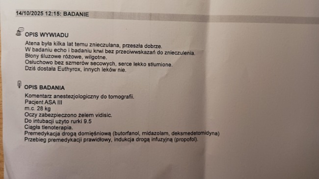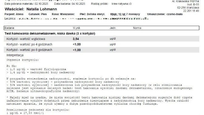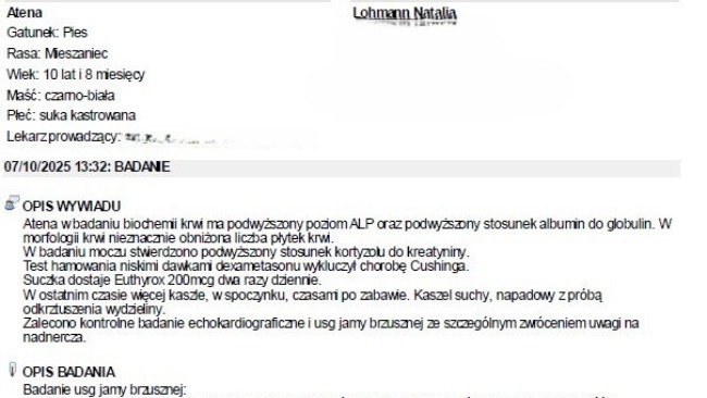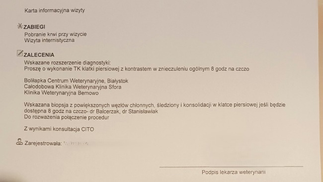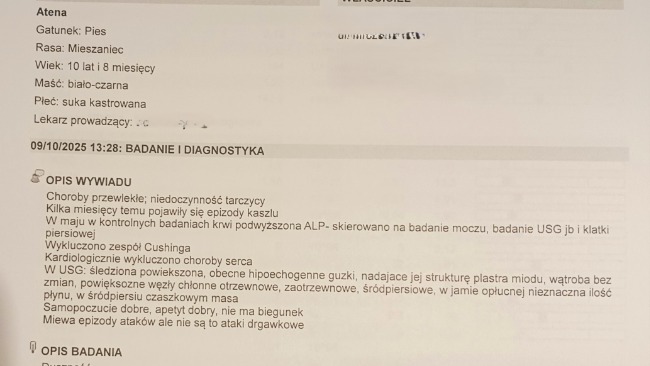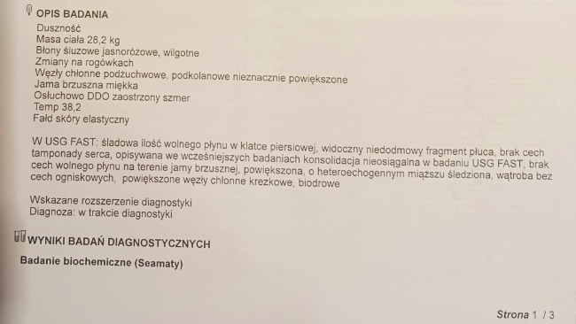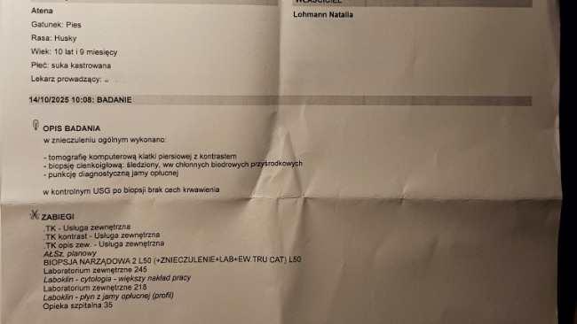 Badania moczu, badanie krwi, USG jamy brzusznej, echo serca, rtg, wizyta onkologiczna.... To wszystko co już mamy za sobą i nadal nie wiadomo co się z Atenką dzieje i nie wiadomo jak ją leczyć. Wykluczony został zespół Cushinga. Wykluczone zostały choroby serca. Podejrzenie chłoniaka na razie nie zostało potwierdzone. Diagnostyka trwa dalej, a koszty rosną w przerażającym tempie. Przed nami tomografia oraz biopsja śledziony, biopsje węzłów chłonnych, badanie cytologiczne płynu z jamy opłucnej. To koszt minimum 3000 zł.