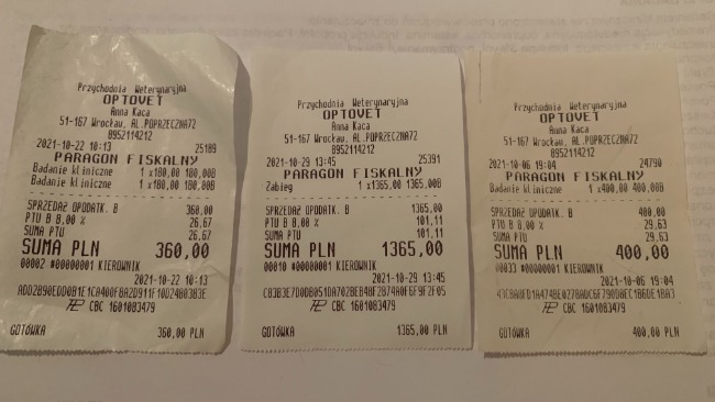 Od kilku lat już staram się aktywnie wspierać zbiórki dla zwierzaków wymagających pomocy, organizuje co jakiś czas zbiórki dla wrocławskiego schroniska wśród znajomych, w tym roku zaczęłam pomagać przy łapaniu bezdomnych kotów – czy to kotek na sterylizację, czy to maluchy, które również brałam do siebie do domu tymczasowego, aby bezpieczne mogły rozglądać się za nowym domem na zawsze. Jednak sama mam dość chorowite koty, mój kocur, który jest ze mną od 4 września 2020 chorował na przewlekły koci katar, którego udało nam się pozbyć dopiero w listopadzie 2020. Jednak niedługo po tym, bo zaraz po nowym roku oba moje koty zaczęły chorować na zapalenie dziąseł. Obu kotom został pobrany kawałek dziąsła, kotce przy zabiegu sterylizacji, kocurowi nieco później (wyniki obu badań w załączonych zdjęciach – cena jednego badania 180 zł). Leczone były hedylonem (dziś wiem, że to był błąd, leczenie sterydem trwało AŻ 6 miesięcy – do zmiany skłoniła mnie wizyta na ostrym dyżurze z moją kotką, gdzie przyjęła nas akurat Pani stomatolog, która zaproponowała inną, co prawda też niekoniecznie dobrą metodę, ale dzięki temu zaczęłam się bardziej zagłębiać w temat leczenia, skoro sterydy obciążają organizm). Na początku października trafiliśmy już pod opiekę poleconego kociego stomatologa, przeprowadzone zostało badanie krwi i ogólne oględziny, wizyta u kardiologa i tuż przed samym zabiegiem wizyta z kotką w związku z zapaleniem pęcherza. 29 października koty zostały poddane pierwszemu zabiegowi. Niestety mój kocur stracił kły, ich stan po złamaniu sprawiał mu tyle bólu, że lepszym dla niego rozwiązaniem było je usunął. Kotce poza usunięciem kamienia (którego jak na 1,5 rocznego kota miała mnóstwo :C) usunięto jej także tylniego zęba trzonowego, zabezpieczono złamanego kła, który za 3 miesiące jest do kontroli – wtedy dowiemy się, czy ząb nadaje się na leczenie kanałowe, czy trzeba go usunąć. Oba zabiegi będą wiązać się z kolejnymi kosztami. Ponad to, po wygojeniu się ran, kocur rozpocznie leczenie dziąseł – prawdopodobnie metodą laserową. Leczymy się już teraz 11 miesiąc, od stycznia do czerwca każdy miesiąc to średnio 150 zł na wizyty i leki, które nie przyniosły skutku – przeprowadzane były także kontrolne badania krwi (co 3 miesiące 4x120 zł = 480 zł). Nie zbierałam nigdy paragonów, jednak koszta październikowe dość mocno odczułam. W samym październiku wychodzi 2925 zł. Ponad to ten październik ostro dał mi w kość z wydatkami.. dlatego też postanowiłam zwrócić się o małą pomoc i założyć zbiórkę 😊 Zwłaszcza, że leczenie jeszcze się nie zakończyło i trochę po kieszeni pociągnie.