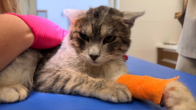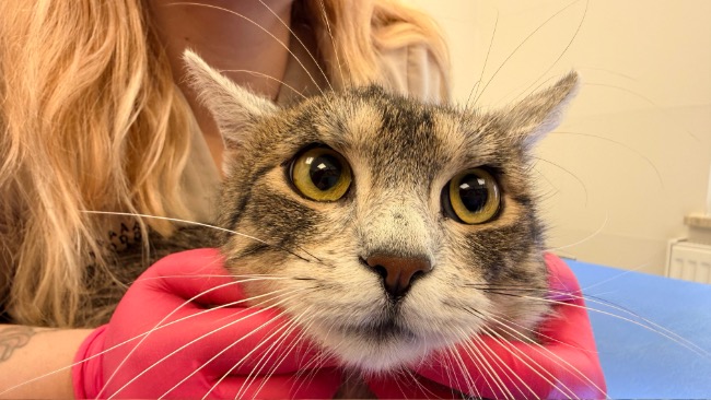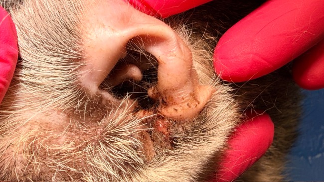 Drapał się do krwi. Jego uszy to obraz skrajnego zaniedbania, świerzbowiec uszny, silny stan zapalny, ogromne ilości patologicznej wydzieliny. Każdy ruch sprawia mu ból. Na głowie ma strupy, bo nie był w stanie przestać się drapać.