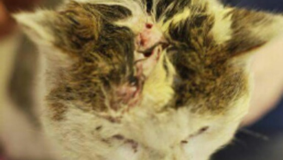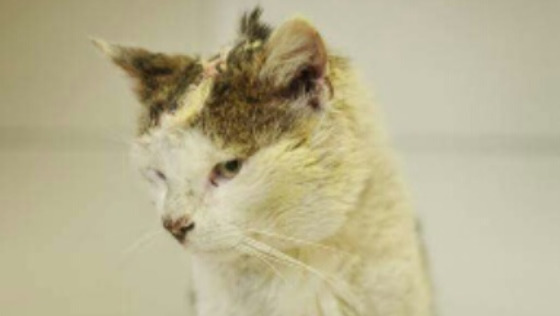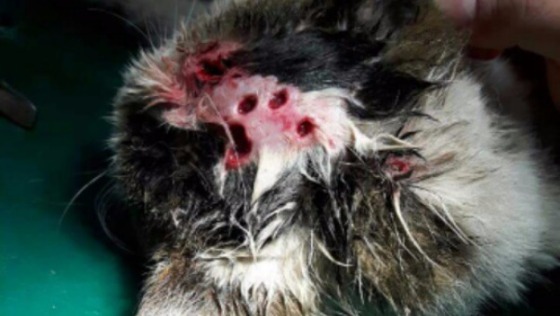Prosto w głowę, według lekarza weterynarii z bliskiej odległości. W kocie główce utkwiło 7 naboi śrutowych. Rany zaczęły ropieć. Kot nie jadł, nie pił, nie chodził. Został zgłoszony do Fundacji.