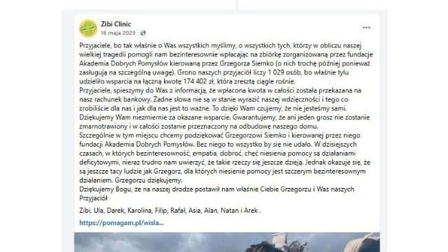 Ta społeczna pomoc ruszyła za zgodą poszkodowanych, dzięki pomocy przyjaciół, strażaków, sąsiadów, lokalnych władz, dziennikarzy i wielu Ludzi Dobrej Woli. Dziękujemy Wam.