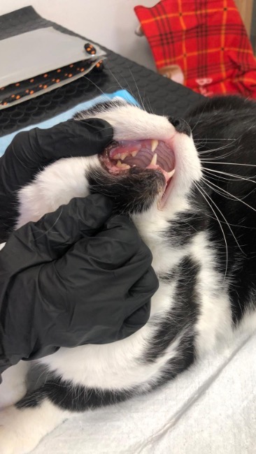 Po przyjęciu wykonaliśmy podstawową profilaktykę: odrobaczenie, szczepienia, badania krwi i testy 🩺. Prymus jest w dobrej formie. Jedynym, co wymaga naszej pilnej interwencji, są jego ząbki — są w złym stanie, konieczna będzie konsultacja i leczenie stomatologiczne 🦷.
