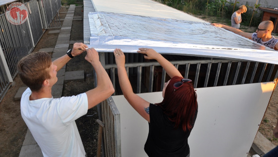 Na tak zabezpieczony dach przykleiliśmy koce termiczne (ratunkowe), aby dodatkowo odbijały od dachu promienie słoneczne.