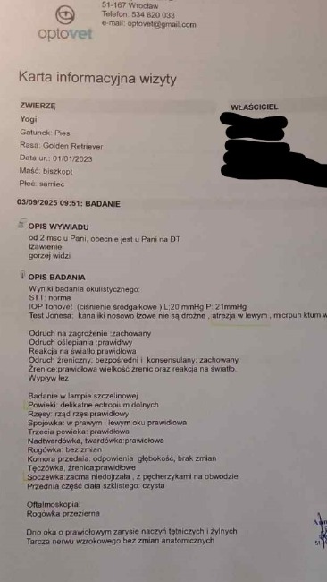 Niestety Yogi traci wzrok... Choroba postępuje, przeszedł już 2 konsultacje u okulistów. Padła jednoznaczna diagnoza - ZAĆMA. Do tego jeszcze niedrożność kanalików łzowych.