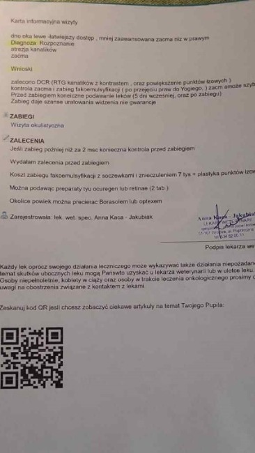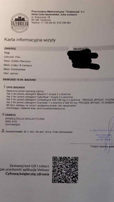 Jedynym ratunkiem jest kosztowna operacja. Koszt operacji zaćmy i udrożnienia kanalików to 8000 zł. Utrata wzorku postępuje i to w zastraszającym tempie. Yogi funkcjonuje coraz gorzej, po zmierzchu potrafi uderzyć w drzewo, budynek ... już ich nie widzi.