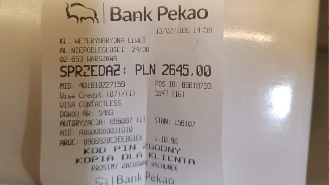 Dziś został opłacony rachunek za diagnostykę i zabieg w wysokości 2645 zł. Zdjęcie rachunku dołączamy do posta. Na fakturę czekamy
