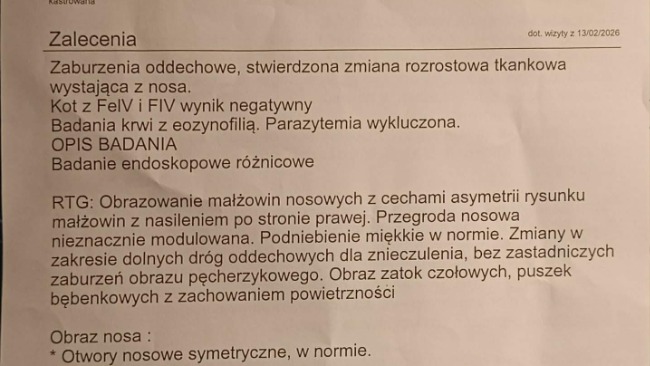 Dzięki Wam Mania mogła przejść specjalistyczną endoskopię. Niestety zakres zabiegu i koniecznych badań okazał się większy, niż pierwotnie zakładano.W prawej jamie nosowej stwierdzono rozrost tkanek i zmiany polipowate, które utrudniają jej oddychanie. Część z nich udało się usunąć, ale nie wszystko mogło zostać wycięte ze względu na krwawienie i ograniczoną widoczność w trakcie zabiegu. Pobrano materiał do badania histopatologicznego oraz badań wirusowych i bakteriologicznych. Czekamy na wyniki, od których zależy dalsze leczenie.