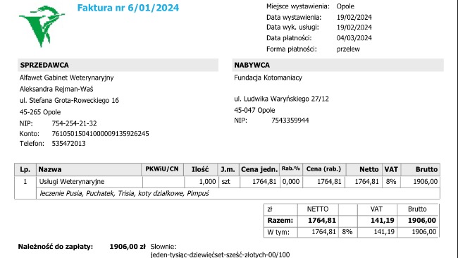 Kochani, musimy opłacić kolejną fakturę na 1900 zł za leczenie kotków, które były kiedyś bezdomne za leczenie Pysi i Puchatka, Trisi, Pimpusia oraz 4 kotków uratowanych z działek.