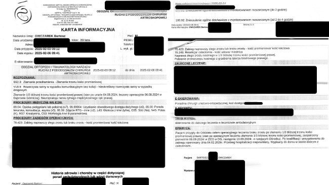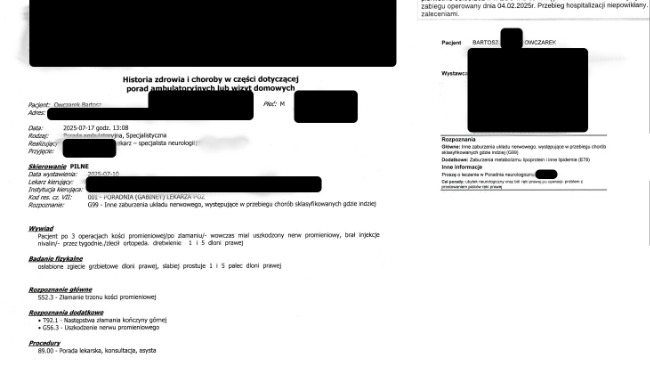 Ponad rok w matni bólu i upokorzenia. Ta jedna „zwykła” operacja spowodowała, że moja kość stale obumierała powodując 3 cm ubytku w kości co widać na RTG przedstawiającym rękę na luty 2025 już po dwóch operacjach (zepsuta w ZCO DG i naprawiająca w Szpitalu Miejskim w Sosnowcu. Do 29.01.2026, przez ostatnie półtora roku przeszedłem poważne 3 operacje stabilizacji kości, w tym jedną z przeszczepem kości z biodra do ręki oraz 1 zabieg biopsyjny - dodatkowe wiercenie drugiego biodra i bolesne ostrzykiwanie szpikiem biopsyjnym, serii ostrzyknięć komórkami wzrostowymi, niekończącą się rehabilitację i zabiegi, przy których ból do prowadzał do utraty przytomności. Co tydzień jestem podpinany pod bardzo nieprzyjemny prąd aby naprawić porażony nerw. Miałem być oparciem dla bliskich, a stałem się człowiekiem, którego partnerka musi myć gąbką na stołku, bo sam nie jest wstanie ustać z bólu, oraz pomagać mi w codziennej egzystencji. To upodlenie, którego nie życzę nikomu, zwłaszcza gdy masz całe życie przed sobą. Miałem być oparciem a stałem się ciężarem, którego sam nie mogę unieść..