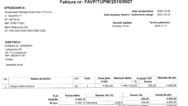 Jeśli nie macie nic przeciwko temu, pozostałą kwotę ze zbiórki przekierujemy na poczet najpilniejszych zabiegów stomatologicznych fundacyjnych koni.