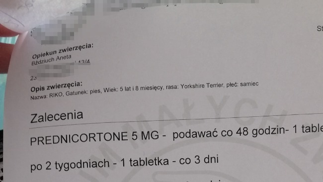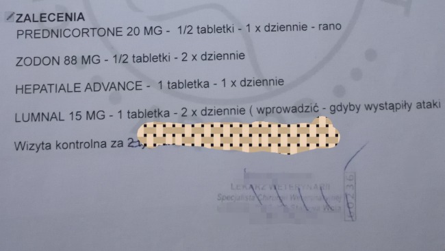 Okazało się wtedy, że mam zapalenie mózgu i opon mózgowych o nieznanej przyczynie. Podobno moja rasa ma predyspozycje do tej bardzo rzadkiej i złej choroby. W literaturze jest bardzo mało opisów przypadków z tą choroba. Ta bardzo ciężka choroba, często prowadzi niestety do śmierci, ale my od początku dzielnie walczymy, aby tak się nie stało. Przechodzę regularnie mnóstwo badań. Sama terapia zapalenia mózgu jest długim procesem, zazwyczaj trwa do końca życia i niestety jest ona dość agresywna dla organizmu. Muszę brać często silne antybiotyki o dużych dawkach, a na stałe codziennie łykam duże dawki sterydów, a także inne leki, m.in. na wątrobę, nerki, stawy, prace mózgu, przeciwbólowe oraz podnoszące moją odporność, ona jest kluczowa, aby mój organizm walczył z tym zapaleniem.