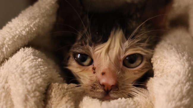 Ma silną biegunkę (leje się z niego woda), koci katar, koślawe przednie łapki, jest wychudzony, odwodniony, mocno zarobaczony. Niesamowicie śmierdzi od choroby i zaniedbania.