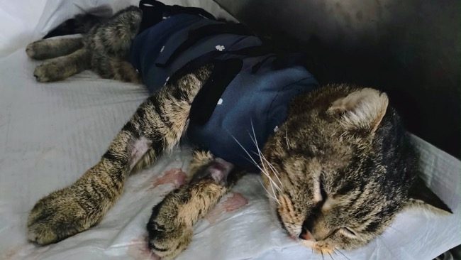 W zeszłym tygodniu kocurek przeszedł poważną operację. Rozpadający się guz wymusił usunięcie części trzustki i śledziony.
