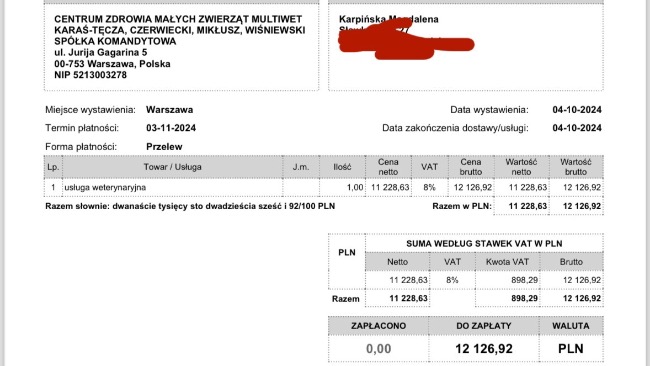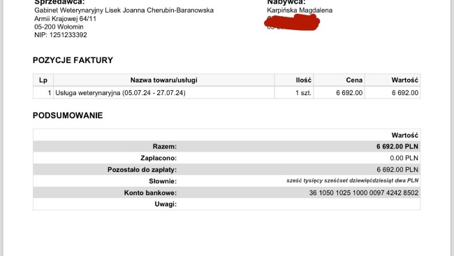 Faktura w klinice całodobowej wystawiona teraz we wrześniu na kwotę ponad 12000 zł 😭