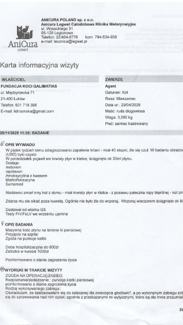 Agent ma ropne zapalenie płuc inaczej ropniak opłucnej. Od ponad tygodnia zalewany jest płynem, który utrudniał mu oddychanie i powoli odbierał życie bo nikt z nas nie mógłby oddychać będąc zalany płynem. Pierwszy raz odbarczany był 24.11 i od razu wprowadzony na dwa antybiotyki- wtedy płyn był z krwią. Agent jadł w międzyczasie dość normalnie, pomimo tego że miał coraz bardziej utrudnione oddychania w zawartość płynu w klatce nie zmniejszała się. 27.11 było już bardzo zle- Weterynarz odbarczał Agenta o 22- wtedy był już krwisty płyn z ropą. Agent przeżył do rana. Gdy pojechałam do Lekarza z zapytaniem co dalej ten powiedział, ze jeśli chcę ratować życie Kota to mam natychmiast szukać Kliniki, która założy Kotu dreny i będzie odbarczany. Trafiłam do Leg-wet- Agent po zbadaniu przez internistę został natychmiast przyjęty na szpital, żeby Go odbarczyć. jest tam tydzień, każda doba to ściąganie płynu i niewiadoma, bo wyniki posiewu i cytologi nie wskazują na żadne bakterie, które mogłyby powodować ropniaka. Jedyną opcją teraz jest zrobienie tomografu by sprawdzić czy Agent miał jakiś uraz czy też perforację przełyku- koszt badania to 1800 zł + kolejne doby w szpitalu, bo na wynik czekamy do 3 dni.