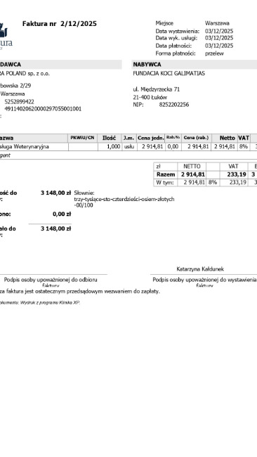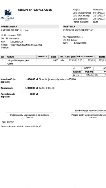 Jako mała, lokalna Fundacja nie dysponuję takimi pieniędzmi żeby je mieć w razie "w"- żeby zapłacić za obecne faktury zapożyczyłam się od Koleżanki. Wszystkie pieniądze pochłaniają codzienne koszty utrzymania dużego stada a duże sumy to pieniądze, które wykładam ze swojej kieszeni.