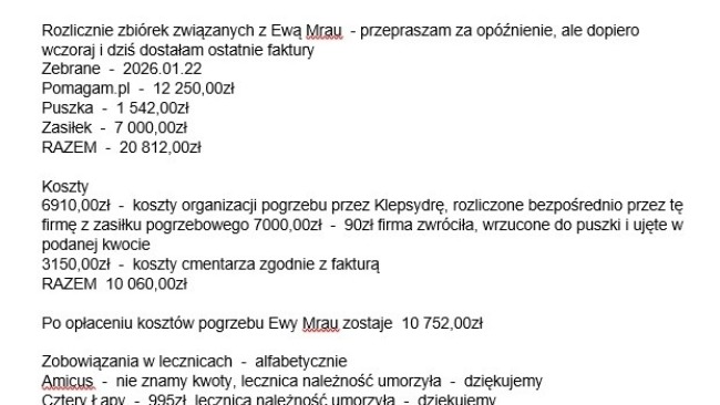 Ewa Mrau Mielczarek odeszła 2026.01.05 - potrzebne są pieniądze na Jej pogrzeb... Zasiłak ZUS (7000zł) nie wystarcza na koszty cmentarza - kwaterę, kaplicę, wykonanie grobu... Bardzo prosimy Was o pomoc w sfinansowaniu tych kosztów...