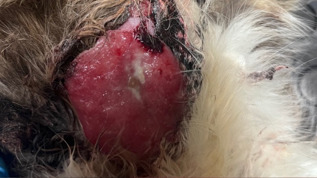 Kotka błąkała się od jakiegoś czasu w okolicy pustostanu. Dokarmiała ją tam osoba, która zgłosiła się do nas, gdyż kotka od pewnego momentu zaczęła mieć problemy z chodzeniem, przewracała się, główkę miała przekrzywioną, a na boku ciała duży krwawiący guz.