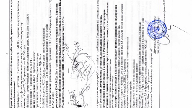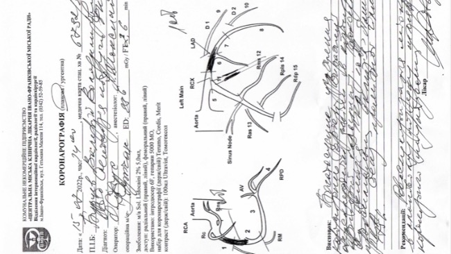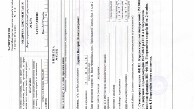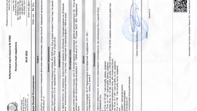 W 2008 r. doznał zawału serca, w 2010 r. – nowotwór złośliwy dróg moczowych (operacja, potem chemioterapia), w 2019 r. – zapalenie płuc (bardzo ciężko zniósł chorobę), w 2021 r. – guz mózgu. Po tym wszystkim przestał chodzić do pracy, ponieważ jego stan się pogorszył. Otrzymali pomoc finansową z ONZ, poszli do lekarzy. Konsultacja z pulmonologiem przebiegła pomyślnie bez wykrycia. Ale po konsultacjach z kardiologiem, USG, koronarografii, a także konsultacjach kardiochirurgicznych z trzema lekarzami, potrzebne jest leczenie i operacja. 2 ekspandery na mostku, jeden kosztuje 27 000hrn + operacja 40 000 hrn = 94 000hrn. Mają mało czasu. Pani Maryna pracuje i zarabia 500 hrn przez 11 godzin, co drugi dzień...