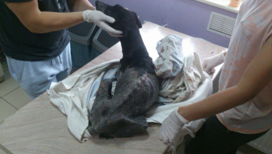 Mała suczka została znaleziona na drodze po lase w miejscowsci Walentynów. Znalazła ja córka mojej kolezanki, która przebywała tam u dziadków. Zabrala sunie do domu i płaczac zadzwoniła do mnie. Według niej suczka wygladała na poparzoną, spaloną. Ja akurat rozpoczełam pracę na drugiej zmianie. Zadzwoniłam do kolezanki, kolegi, do lekarza. Kolezanka Kasia pojechała na miejsce i pierwsza zobaczyła sunię. Ona ja zabrała, zrobiła pierwsze zdjęcia i filmy. Nastepnie sunie przekazała Konradowi, który zawiózł ja do lecznicy PulsVet do Pionek. Tam lekarz juz czekał na sunie. Na podstawie zdjęc i stanu skóry wszyscy mysleli, ze sa to rany po oparzeniu, moze pożarze . Lekarz po ogledzianach i badaniach stwierdził, ze sunia ma nuzyce . Nuzyce w bardzo zaawansowanym stadium. Ropiejace, smierdzace rany, opuchlizna, temperatura 40 stopni. Siersc tylko na głowie i częsci szyi. Cierpienie trudne do wyobrazenia. Złe wyniki badan.